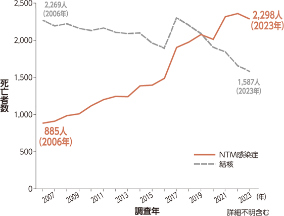 肺NTM症は、NTM菌という菌に感染することで発症する呼吸器感染症で、「NTM」は「エヌティーエム」と読みます。日本語では、「非結核性抗酸菌症(ひけっかくせいこうさんきんしょう)」といいます。近年、増加傾向にあることがわかっており1)、死亡者数も増えていることから2)、注意が必要な感染症のひとつです。